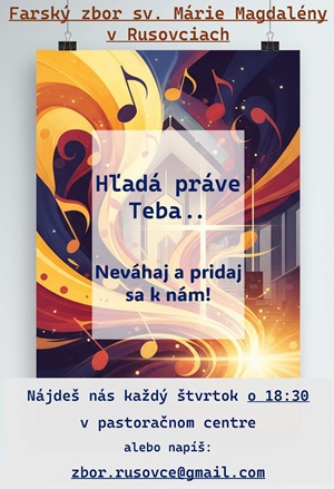 Ak  radi spievate, prípadne hráte na nejaký hudobný nástroj, napíšte nám na zbor.rusovce@gmail.com alebo rovno príďte medzi nás. Stretávame sa každý štvrtok o 18:30 hod. v Pastoračnom centre v Rusovciach.